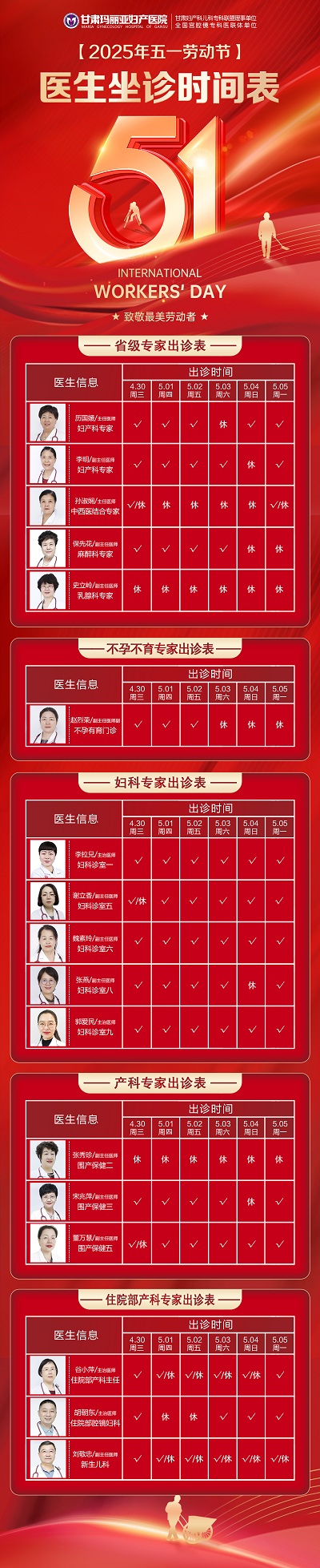 甘肃玛丽亚妇产医院2025年五一劳动节医生坐诊时间表