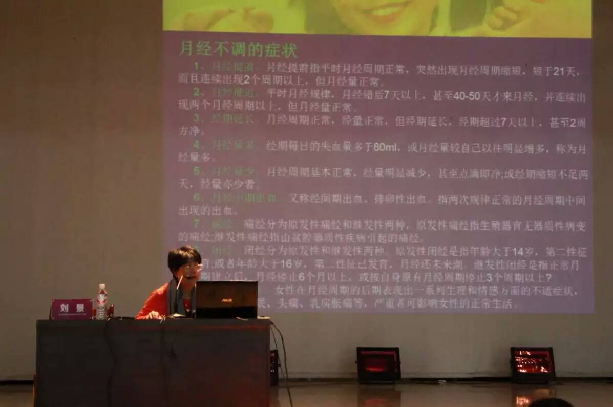 刘景,主治医师,从事妇产科临床工作20余年,熟练掌握妇产科各类疾病的诊治。刘医师的讲座通俗易懂,重点讲解了大学女生常见病的预防保健知识,如月经不调、痛经;早孕的判断、宫外孕的症状等等,还讲到了日常健康保健等,受到了同学们的欢迎。