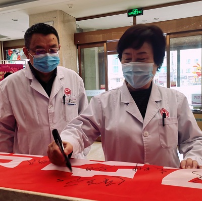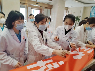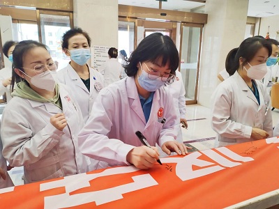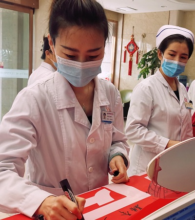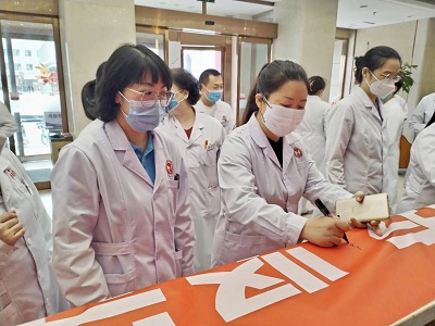 院长杨春秀带领全体医护宣誓:1以服务患者为中心,以保证医疗质量为生命;诚信行医,坚守医务人员职业道德;确保收费公开透明,维护患者知情权;严密保护患者隐私,捍卫患者人格尊严;不收受红包礼包,对患者一视同仁;不断提升医疗水平,为患者提供优质服务;技术上精益求精,努力提高医疗质量;患者至上,接待患者热心、耐心、细心、有责任心;发扬协作与团队精神,不断更新医学知识和理念;奉行人道博爱的精神,履行救死扶伤职责;珍惜生命之托,消除病痛,促进健康,维护医师的圣洁与崇高,为人类健康事业奋斗终身。