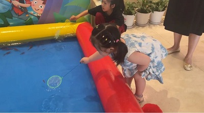 “捕鱼达人”,乍一听感觉像个网络游戏,其实不然。一个充气的巨大池塘在一楼大厅倚墙而立,生动的背景墙与之相互呼应,清澈的水里,鱼儿在欢脱畅游。只要能在5分钟里捕到鱼儿,就可尽数据为己有,还能赢得精美奖品。这个游戏深得小朋友们的喜爱,要知道,本来小动物就是小朋友们最好的朋友和伙伴。您瞧,小家伙们聚集在池塘边争先恐后,不知疲倦的追逐着鱼儿,尽其所能捕到最多的鱼。当提着满满当当的鱼和奖品满载而归的时候,开心洋溢在每个人的脸上。