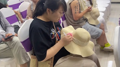 动若脱兔,静若处子。如果说参与游戏的孕妈妈的表现是动若脱兔的话,那么参与手工制作的孕妈妈就表现得静若处子。手工区,心灵手巧的孕妈妈们正在静静地做着手工——DIY手工草帽。